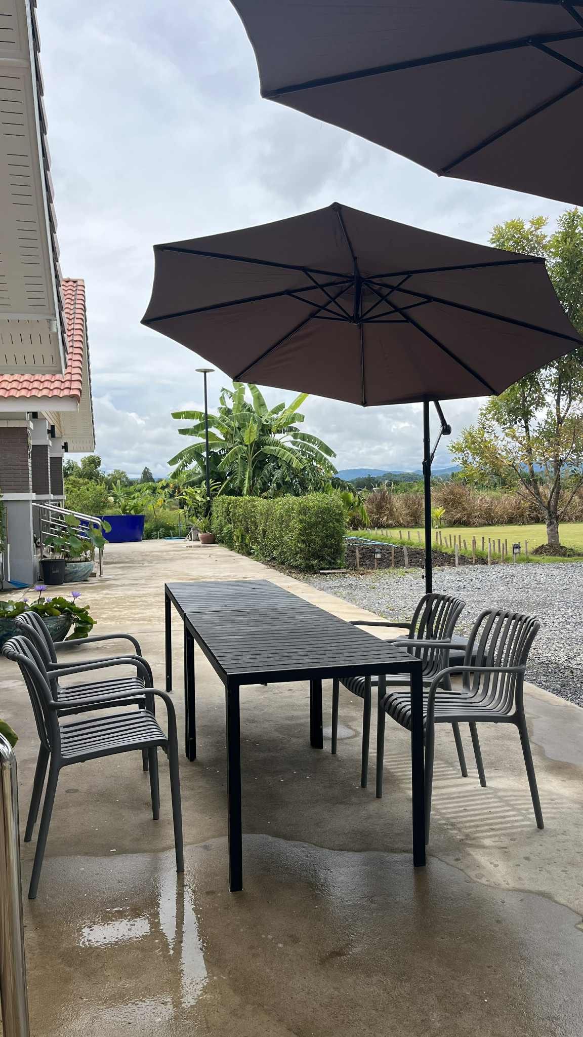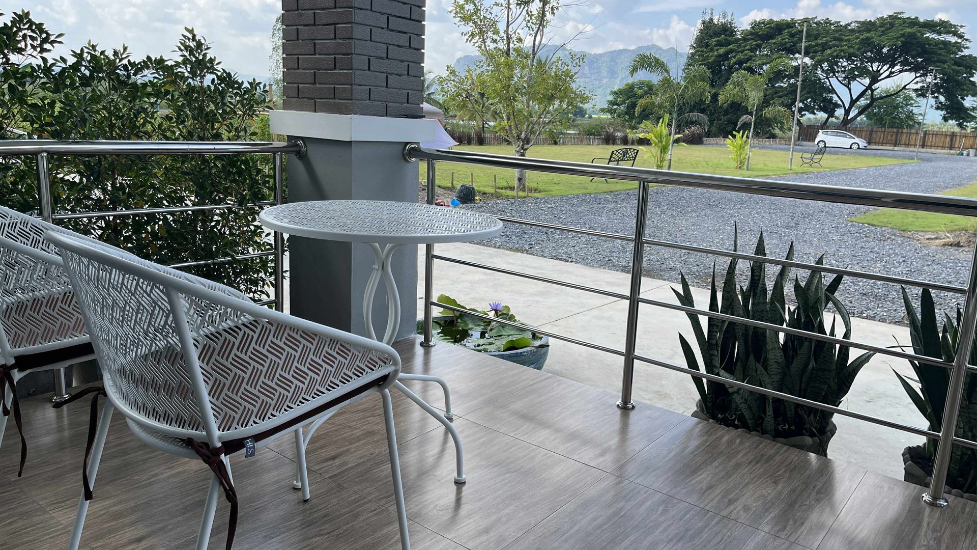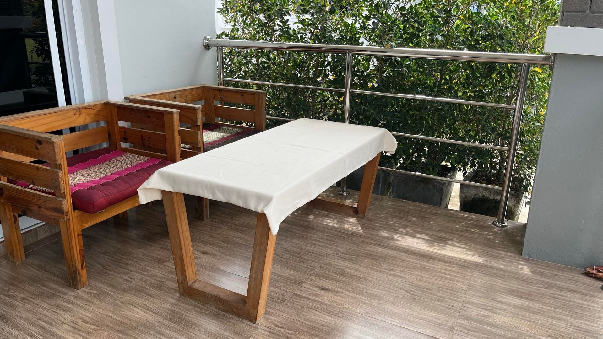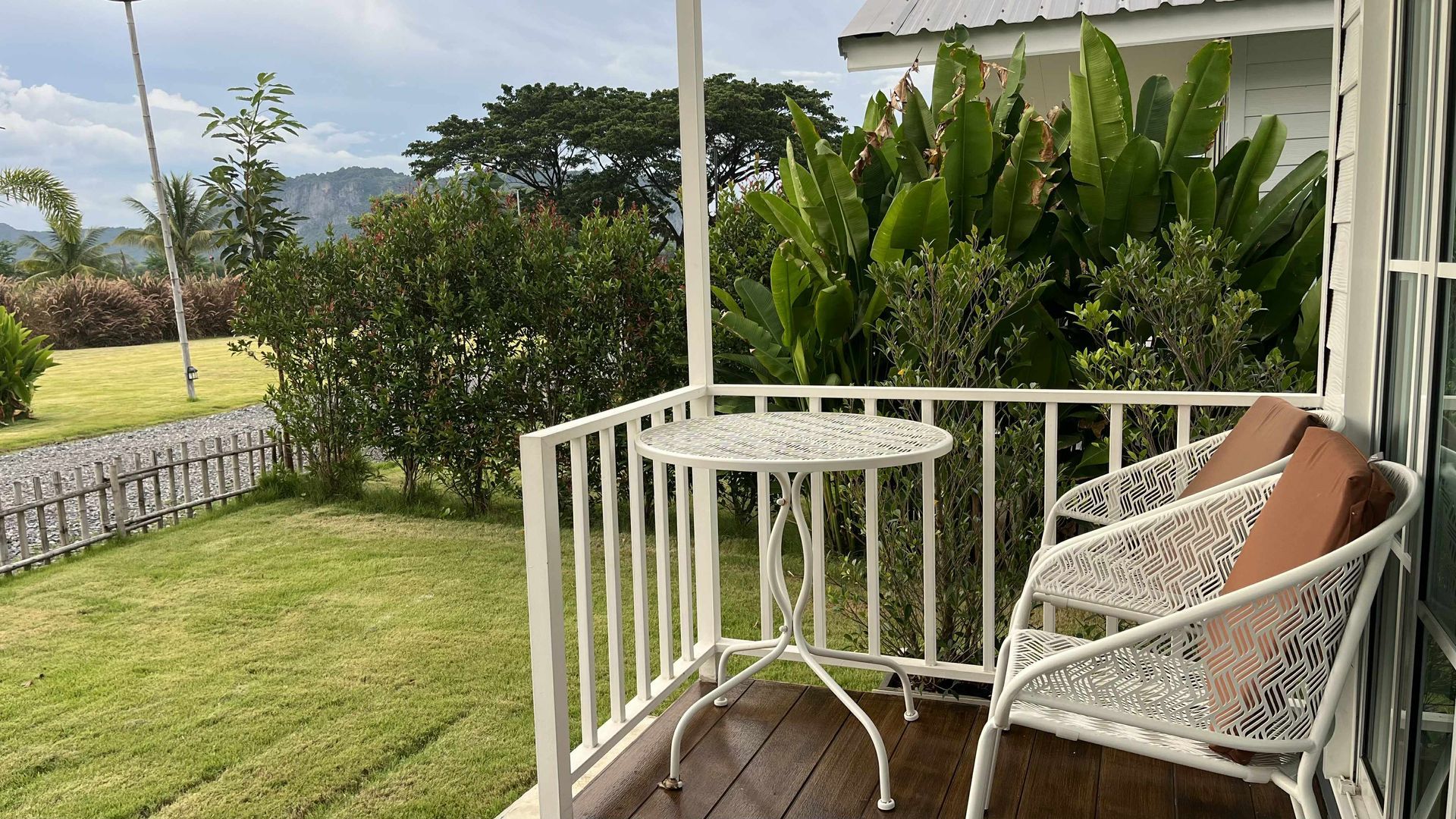 ด้านนอกมีพื้นที่นั่งเล่นพร้อมโต๊ะสำหรับอ่างน้ำร้อนและเปลญวน