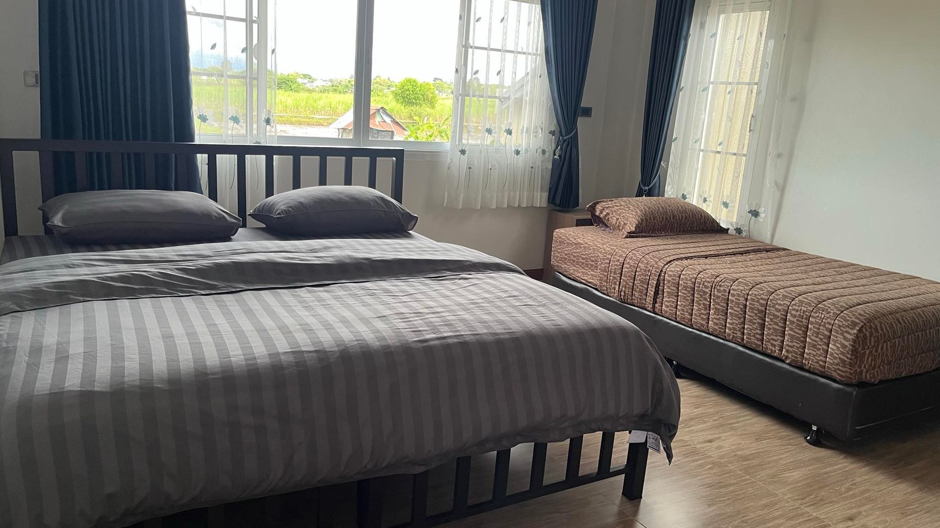 บ้านคุณแม่พักได้ 6 - 8 ท่าน มีห้องนอนสองห้องพร้อมเตียงคู่และเตียงเดี่ยวสองเตียง สามารถจองที่พักเพิ่มเติมได้